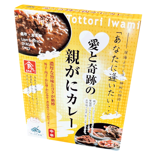 日本海産ズワイガニのメス「親がに」の殻、赤子、内子、身を無駄なく使い、岩美町産のタマネギ、白ネギなどと一緒に煮込んだ。カニのうま味が凝縮されたオリジナルカレー。