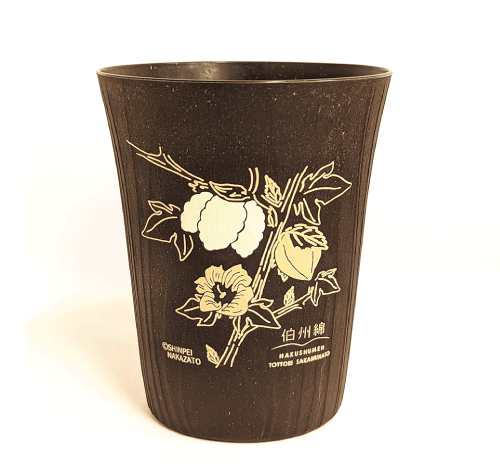 伯州 綿の綿花の収穫後に廃棄されている枝を利用して、企業と境港市が共同開発したSDGsなタンブラー。デザインは地元で伯州綿のシャツを製造販売する 仲里 心平さんが手掛けた。