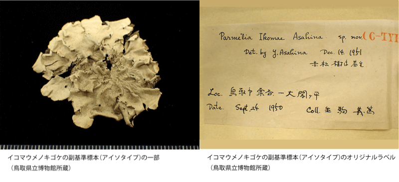 こうした熱意が実を結び、1953年に新種「Parmelia ikomae(イコマウメノキゴケ)」が朝比奈博士によって発表されました。学名と和名は、採集者である生駒氏への献名です。鳥取県立博物館には、このとき新種記載の基準となった標本を分割した「副基準標本(アイソタイプ)」が収蔵されています(写真)。これは分類学的に極めて価値のある、いわば〝種名の基準〟となる貴重な資料です。